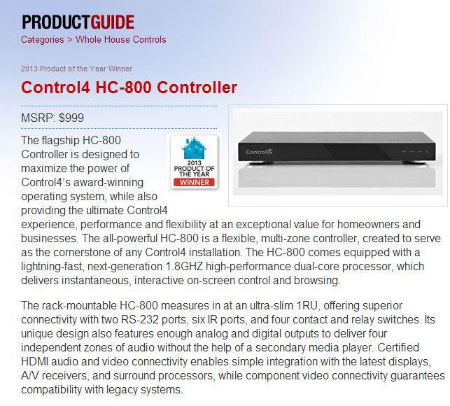 Control4 HC-800 wins 2013 Electronic House Product of the Year Award for Whole House Control & Automation Systems: